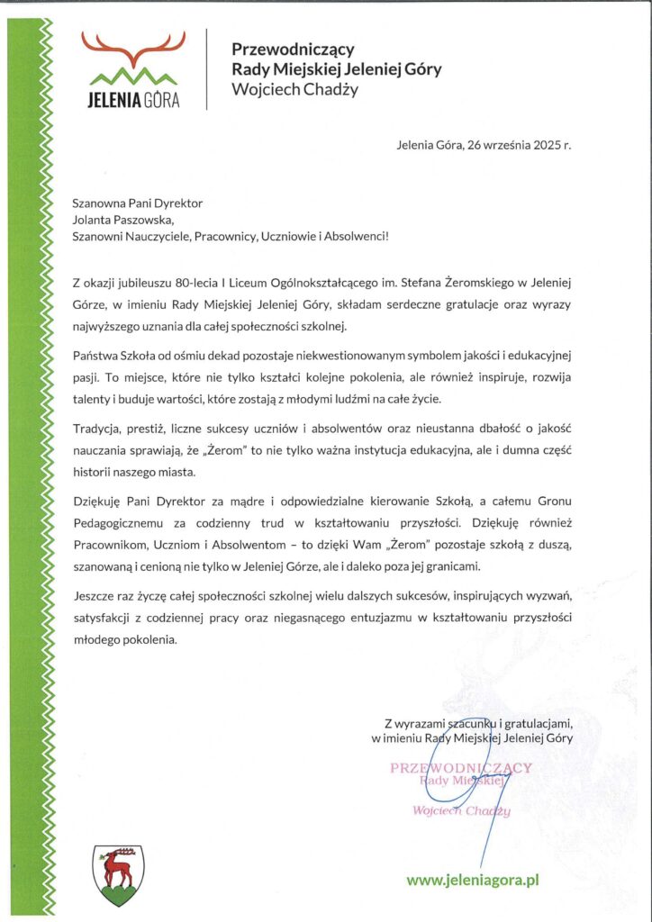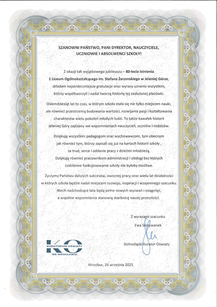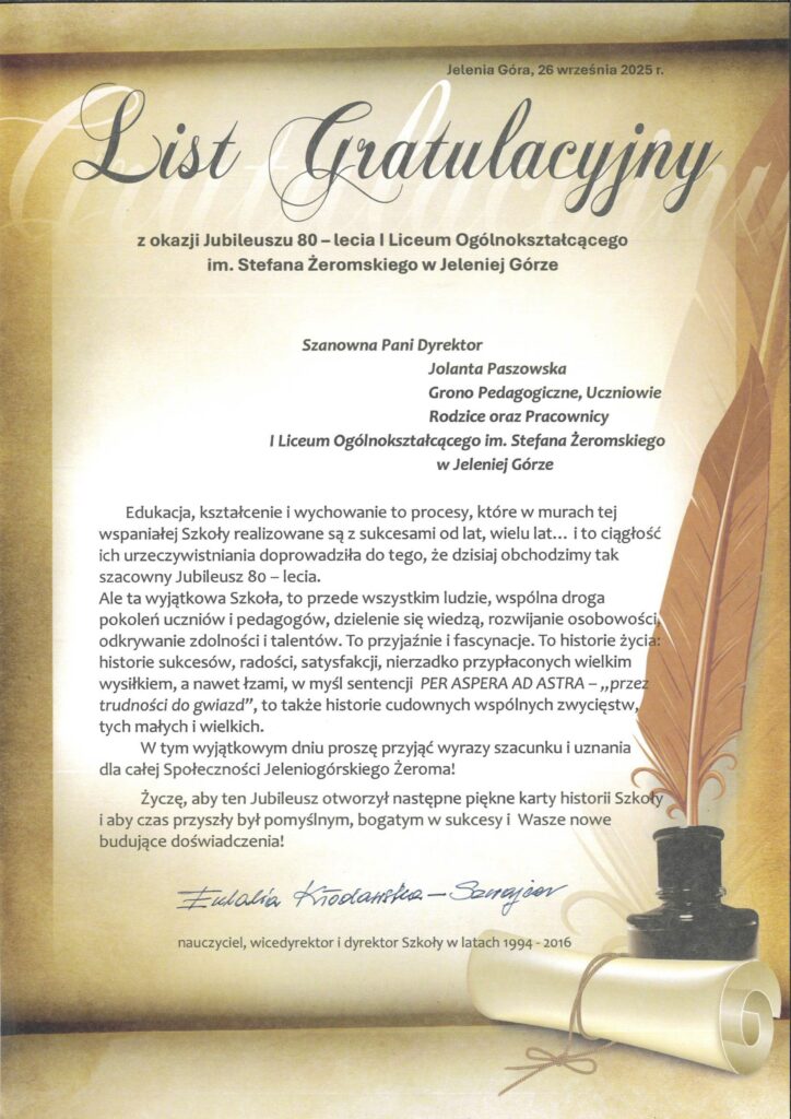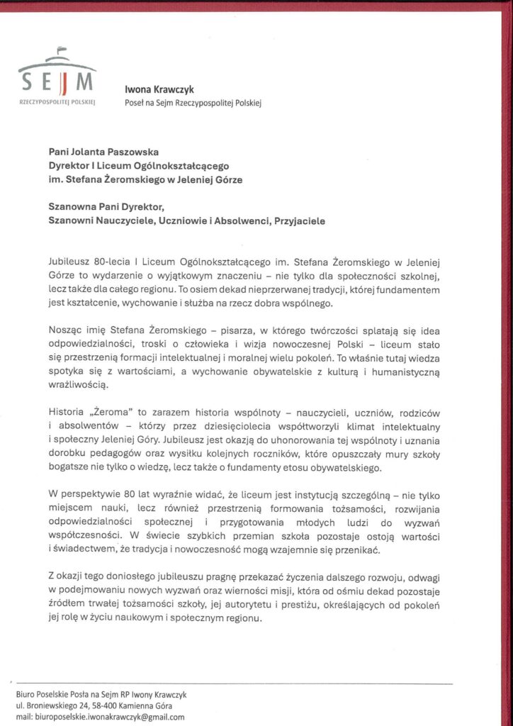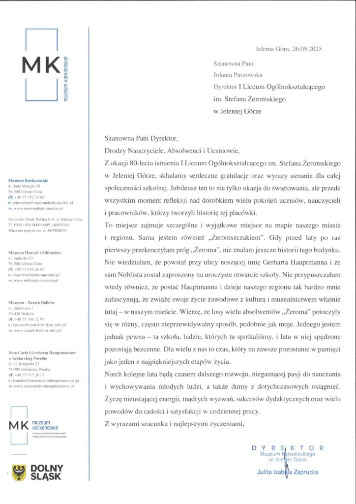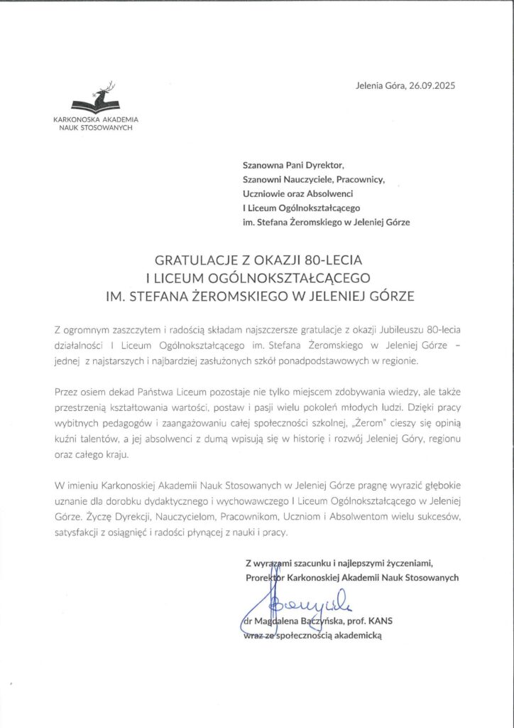 Rok jubileuszowy trwa, ale uroczystość obchodów 80-lecia I Liceum Ogólnokształcącego im. Stefana Żeromskiego w Jeleniej Górze już za nami. Bardzo dziękujemy, że zaszczyciliście nas Państwo swoją obecnością. Jesteśmy wdzięczni za wszystkie miłe słowa przekazane w listach gratulacyjnych i powinszowaniach. Otrzymaliśmy też wiele pięknych i wartościowych upominków okolicznościowych. Utwierdzają nas one w przekonaniu, że oprócz misji edukacyjnej jaką pełni nasza placówka, jest ona także miejscem spotkań i integracji oraz bliskich, osobistych relacji społeczności szkoły z szerokim gronem absolwentów, emerytowanych nauczycieli i pracowników naszego „Żeroma”.