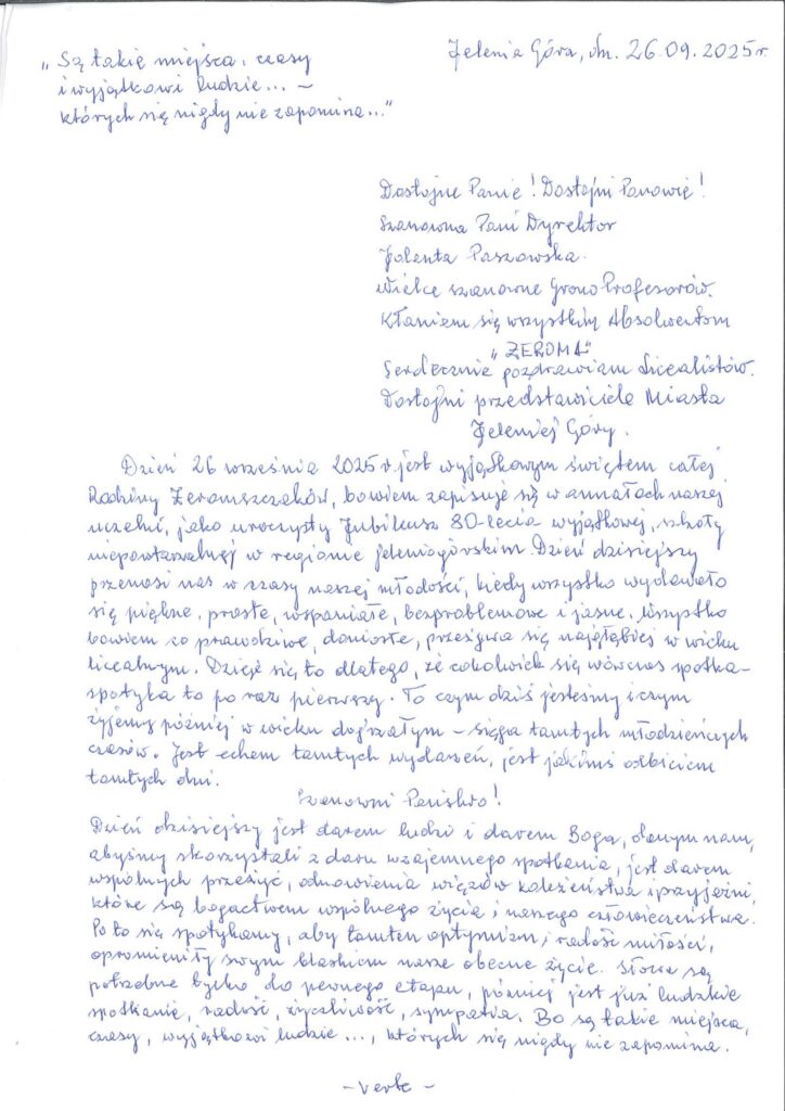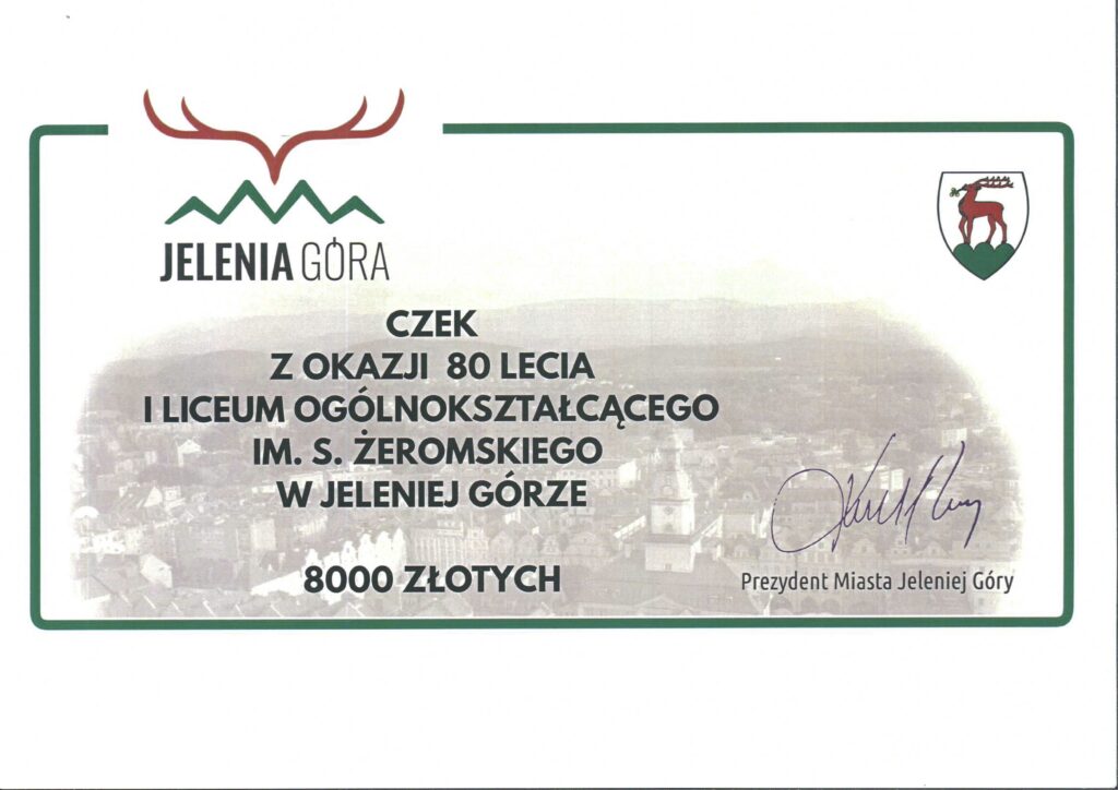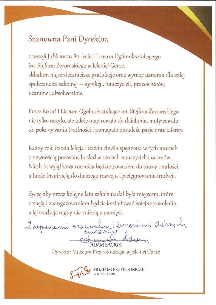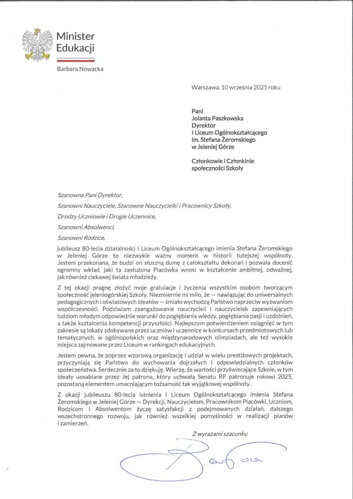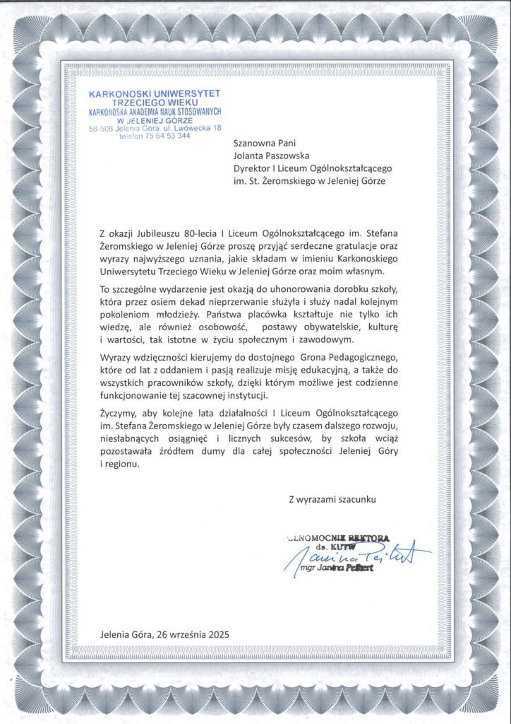 Rok jubileuszowy trwa, ale uroczystość obchodów 80-lecia I Liceum Ogólnokształcącego im. Stefana Żeromskiego w Jeleniej Górze już za nami. Bardzo dziękujemy, że zaszczyciliście nas Państwo swoją obecnością. Jesteśmy wdzięczni za wszystkie miłe słowa przekazane w listach gratulacyjnych i powinszowaniach. Otrzymaliśmy też wiele pięknych i wartościowych upominków okolicznościowych. Utwierdzają nas one w przekonaniu, że oprócz misji edukacyjnej jaką pełni nasza placówka, jest ona także miejscem spotkań i integracji oraz bliskich, osobistych relacji społeczności szkoły z szerokim gronem absolwentów, emerytowanych nauczycieli i pracowników naszego „Żeroma”.