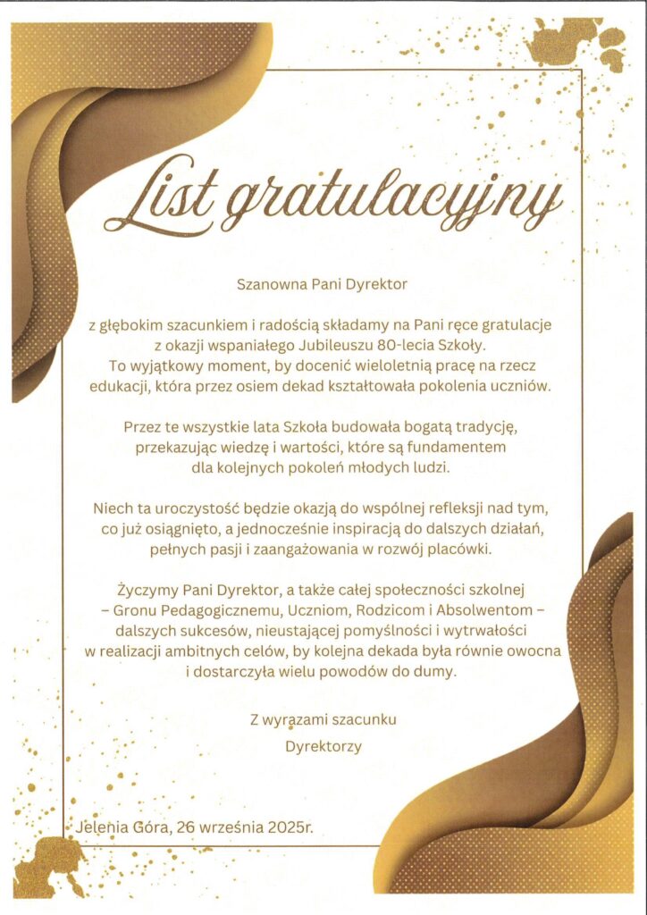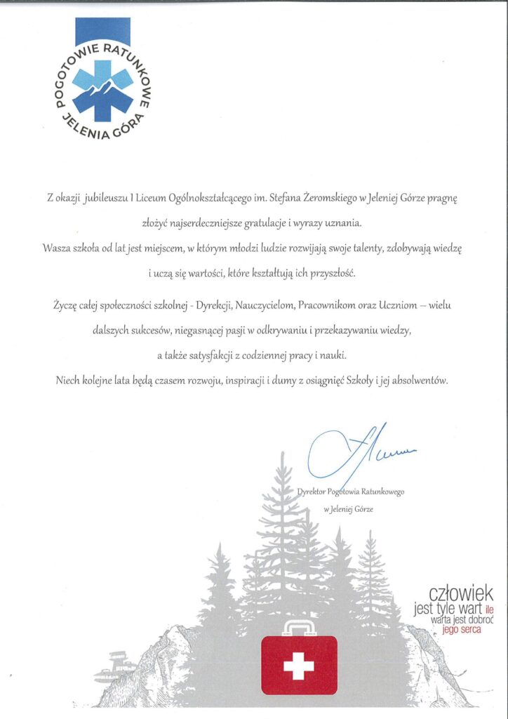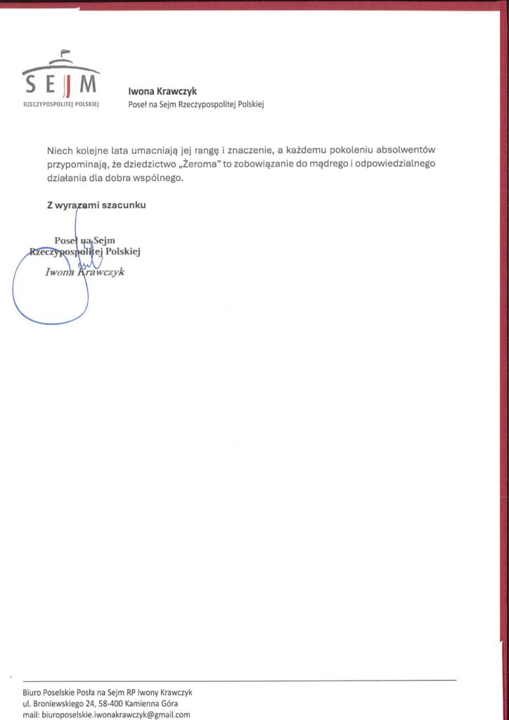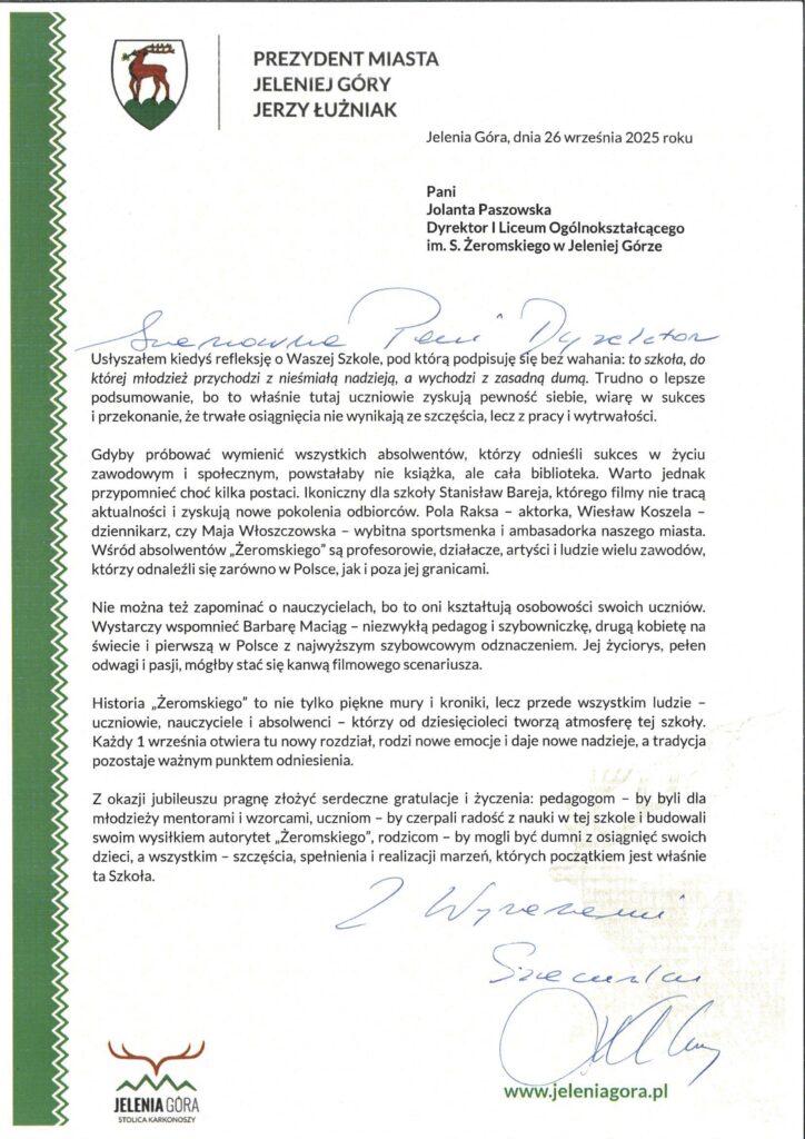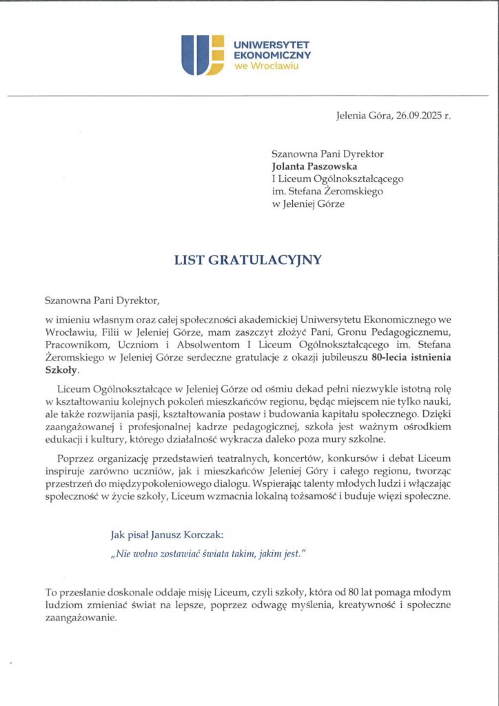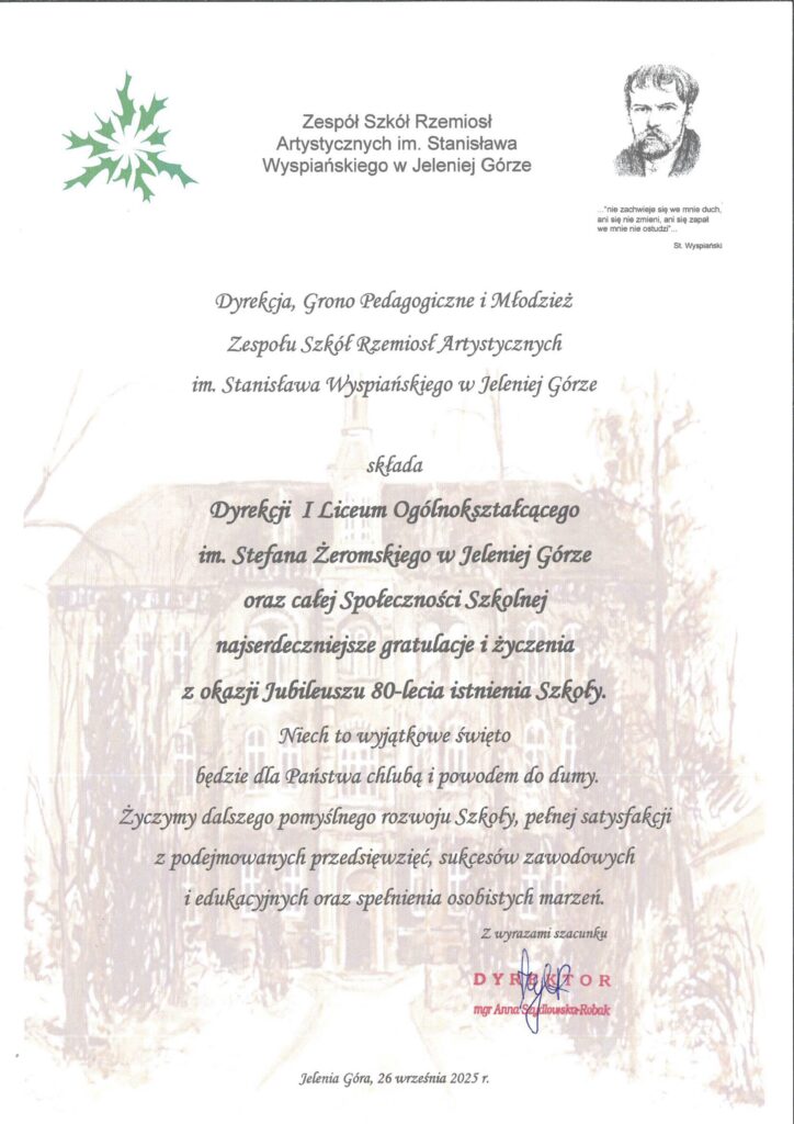 Rok jubileuszowy trwa, ale uroczystość obchodów 80-lecia I Liceum Ogólnokształcącego im. Stefana Żeromskiego w Jeleniej Górze już za nami. Bardzo dziękujemy, że zaszczyciliście nas Państwo swoją obecnością. Jesteśmy wdzięczni za wszystkie miłe słowa przekazane w listach gratulacyjnych i powinszowaniach. Otrzymaliśmy też wiele pięknych i wartościowych upominków okolicznościowych. Utwierdzają nas one w przekonaniu, że oprócz misji edukacyjnej jaką pełni nasza placówka, jest ona także miejscem spotkań i integracji oraz bliskich, osobistych relacji społeczności szkoły z szerokim gronem absolwentów, emerytowanych nauczycieli i pracowników naszego „Żeroma”.